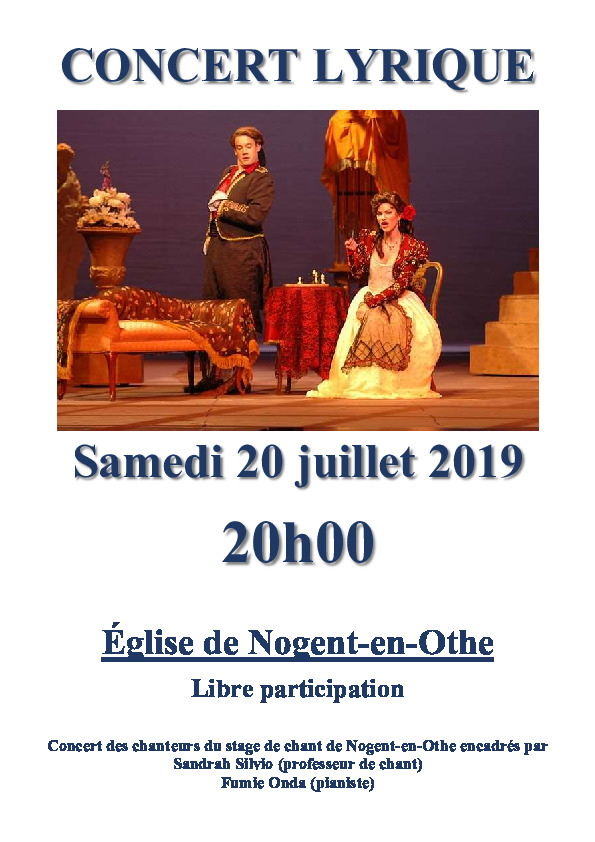 - 11 juin 2022, à 20h30: Concert de musique cubaine, avec Los Guajiros! - 08 août 2020, à 20h30: Concert des chanteurs du stage de chant lyrique. - 20 juillet 2019, à 20h30: Concert des chanteurs du stage de chant lyrique. - 22 juin 2019, à 20h30: Retour du trio de jazz Manouche d'Adrien Marco qui s'était déjà produit en 2014, toujours aussi excellents! - 21 juillet 2018, à 20h30: Concert des chanteurs du stage de chant de Nogent en Othe, extraits d'opéras,musique sacrée etc. - 26 mai 2018, à 20h30: spectacle autour de l'œuvre de Boris Vian (musique et textes). - 30 septembre 2017, à 20h30: Les chanteurs de l'association MESSA DI VOCE ont présenté un concert lyrique de duos de mélodies françaises.Œuvres de Fauré, Franck, Gounod, Viardot... - 24 juin 2017, à 20h30: La salsa débarque à Nogent avec "Los Guajiros", groupe endiablé de musique cubaine! 15 octobre 2016, à 20h30: Concert avec le trio "Comme à la maison" (guitare, contrebasse, accordéon, chant). Musiques de l'Est et d'ailleurs... - 30 avril 2016 Extrait d'un opéra de John Blow, musique baroque anglaise. Téléchargez l'affiche du concert! - 3 octobre 2015 Duo voix-guitare «Côté Sud», répertoire jazz, chanson française et d'amérique du sud. Téléchargez l'affiche du concert! - 13 juin 2015 Concert avec "Le Bavolet Flotant", musique baroque de Bach et Telemann, "Airs et Cantates". Le programme complet est disponible ici. Téléchargez l'affiche du concert! - 18 octobre 2014 à 17h. Concert de Jazz manouche, avec Adrien Marco Trio. Téléchargez l'affiche du concert! - 13 juillet 2014 à 17h. Concert de soutien avec Wonderous Machine, ensemble baroque. Œuvres de Purcell, Charpentier, etc... Clavecin, violes, flutes, voix sopranos et baryton. - 27 juillet 2013 Concert du groupe Pythagore, qui a eu les honneurs de l'Est-Eclair. - 1er juin 2013 Concert de François en trio, groupe de la jeune scène française musicale. Energie, émotion, humour! Pour en savoir plus, allez voir son site ou les photos du concert. - 26 octobre 2012: inauguration des peintures de l'église. Tous les détails sur notre page actualités. - 2010 : Rencontre avec l'ensemble vocal Pythagore et le trio à bec Uccelini. Au programme des œuvres autour de Monteverdi, Falconieri, Bach, Teleman. - 2009 : de nouveau, concert de jazz "manouche" et chant tzigane, toujours avec "Les Valseuses", et en plus Grazyna Pawlikowski au chant.